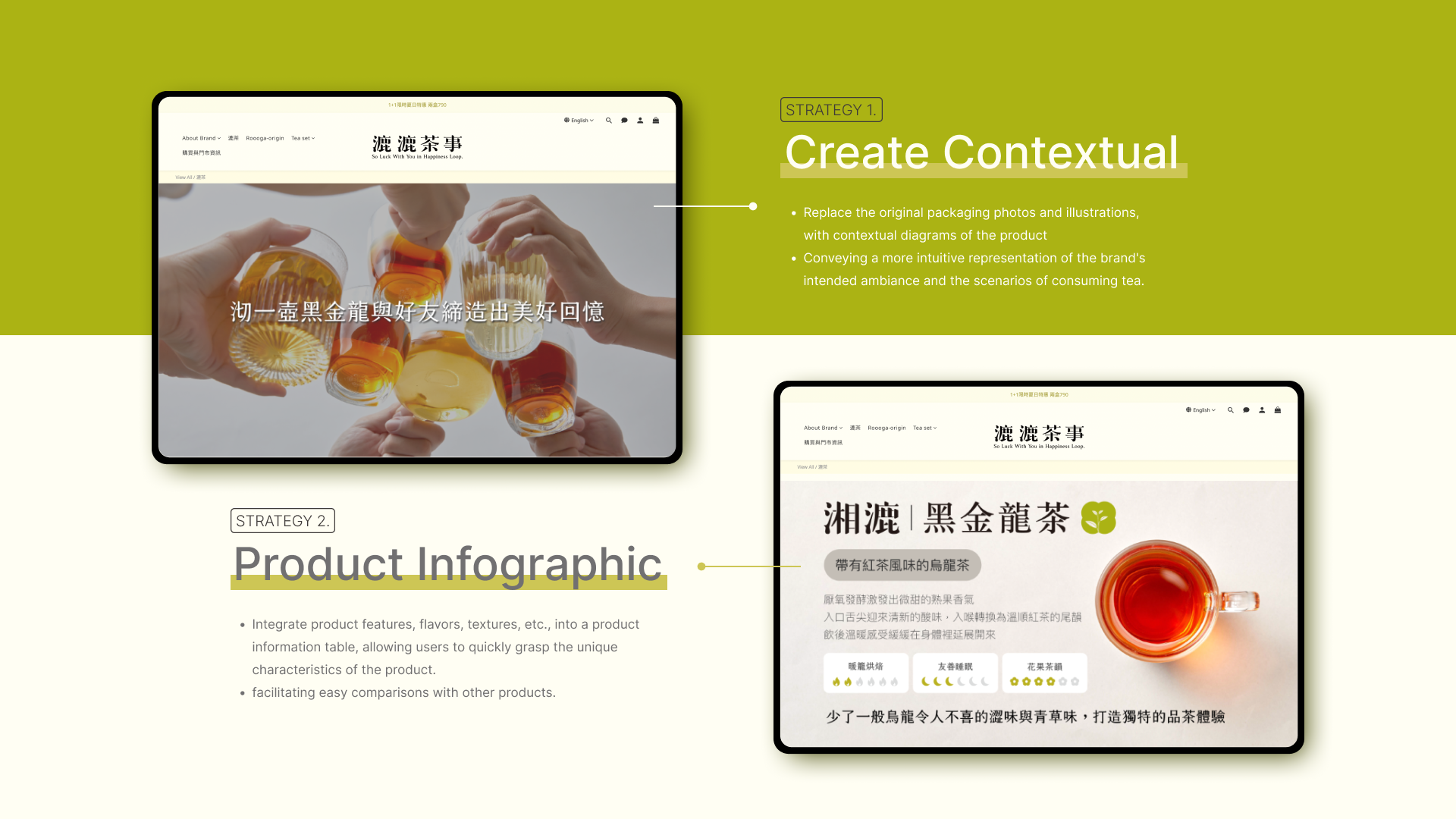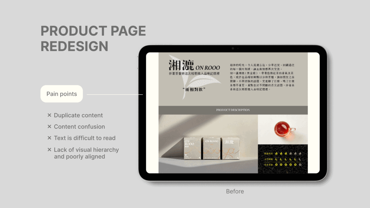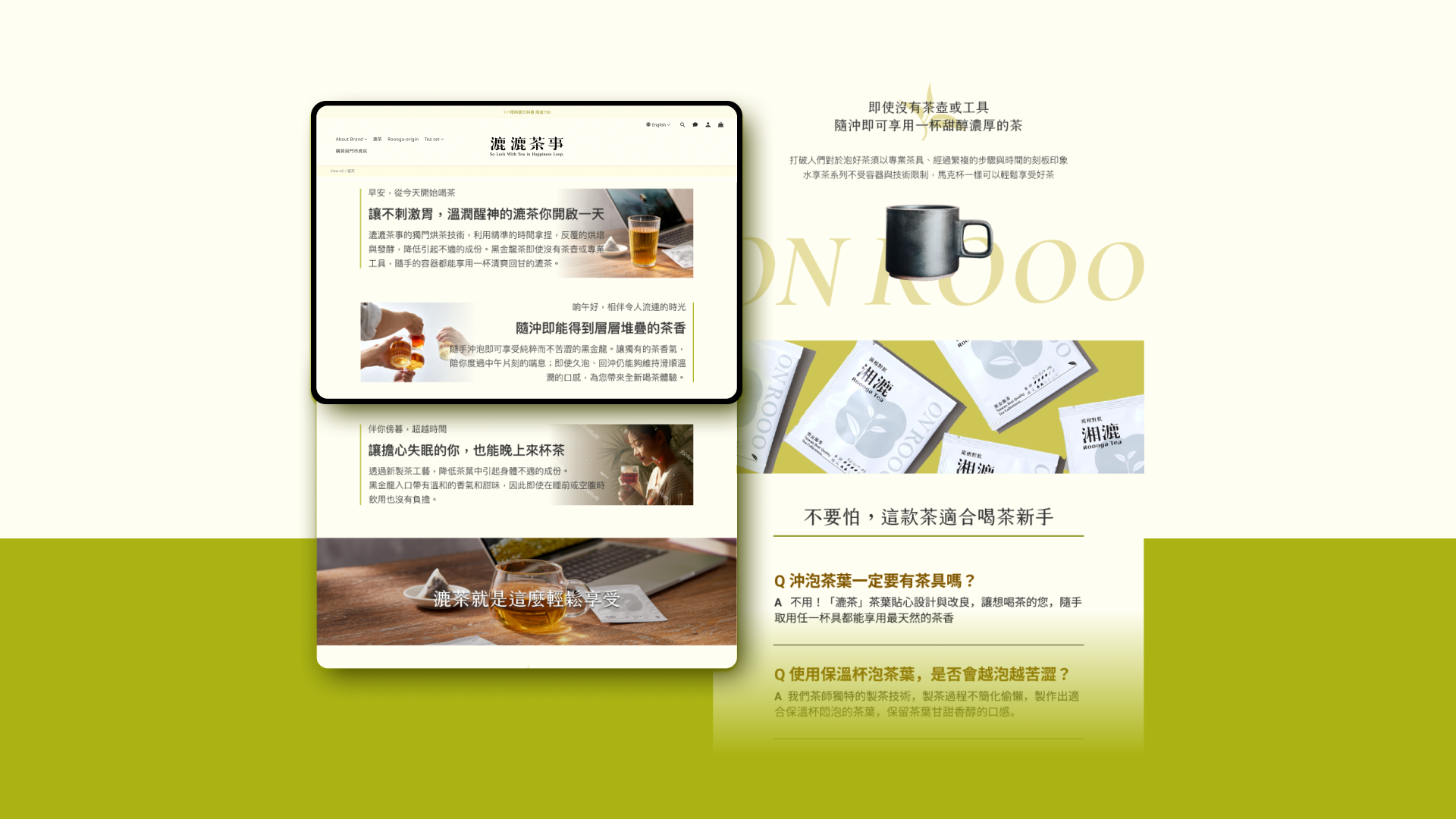 專案為漉漉茶事品牌因應廣告行銷策略,而進行的網站視覺優化內容之一。品牌由商品頁面作為起點,進行品牌官網整體視覺設計的優化。商品頁面的視覺策略著重於強化品牌獨特的記憶點;我們以「漉漉茶提供簡單方便的泡茶體驗」為概念,進行頁面資訊的梳理,取代優化前的插畫手法,改以直觀的情境圖照片渲染使用產品的感受,並將產品資訊視覺化,使消費者更容易比較產品的差異。並將原先產品的描述文字調整為 FAQ 區塊,減少使用者閱讀段落文字的負擔。